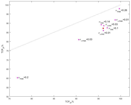 Illustration of the impact of different population radio-sensitivity parameter values on the predicted treatment outcome in terms of population TCP. TCP of the group treated with three fractions—axis X; TCP of the group treated with two fractions—axis Y. The solid red dot corresponds to the population TCPs calculated based on the parameter values from Equations (6) and (7). The varied parameter values are denoted in the figure.