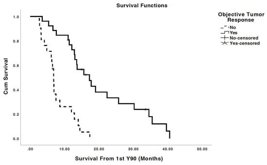 Median OS was 12.9 months from the time of first Y90 treatment. Overall, 26 (55%) patients had OR at 3 months post Y90 SIRT and 21 (45%) patients did not have OR per Response Evaluation Criteria in Solid Tumors (RECIST) version 1.0. Patients with OR had a significantly prolonged OS of 17.2 months from the time of first Y90 SIRT versus 6.8 months for the patients without OR (p < 0.001) (Figure 1).