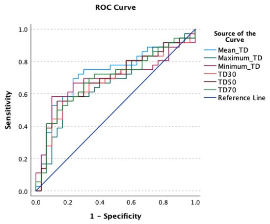 ROC Curve for dosimetry parameters predicting partial or complete response based on Response Evaluation Criteria in Solid Tumors with the following AUC’s: Mean TD (0.730), TD 30 (0.679), TD 50 (0.690), TD 70 (0.692), maximum TD (0.692), minimum TD (0.666).
