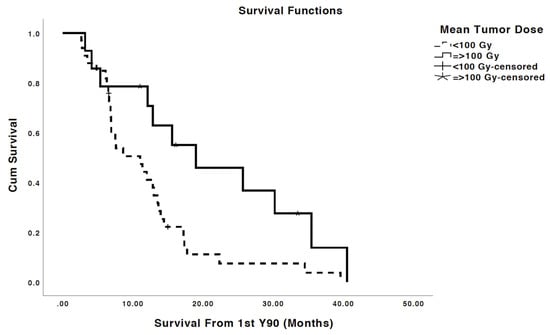 The results of this study were congruous with those of prior studies in showing a significantly prolonged overall survival in patients with objective response by RECIST following Y90 treatment compared to patients without objective response by RECIST [,]. Hence, determining tumor dose thresholds to achieve objective tumor response is of paramount importance to improve patients’ outcomes. Aside from OR, other imaging characteristics have also been shown to be predictive of outcomes in CRLM treated with Y90 SIRT []. For example, a phase III clinical research trial with 10 patients found that a tumor-to-normal ratio cutoff of 1 on MAA shunt studies could predict metabolic response [].