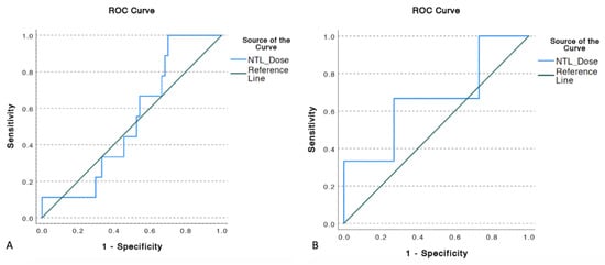 ROC curve for evaluation of relation of mean NTL dose and development of (A) CTCAE grade ≥ 3 liver toxicity (AUC: 0.532, p = 0.712) and (B) REILD (AUC: 0.667, p = 0.349) demonstrated mean NTL dose to not be a statistically significant predictor for either outcome.