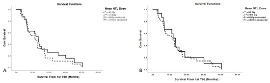 Mean NTL dose thresholds of 45 Gy (A) and 60 Gy (B) did not predict prolonged or shorter OS from the time of first Y90 radioembolization, p-values 0.401 and 0.547, respectively.