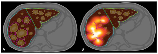 - Levillain, H.; Bagni, O.; Deroose, C.M.; Dieudonné, A.; Gnesin, S.; Grosser, O.S.; Kappadath, S.C.; Kennedy, A.; Kokabi, N.; Liu, D.M.; et al. International recommendations for personalised selective internal radiation therapy of primary and metastatic liver diseases with yttrium-90 resin microspheres. Eur. J. Nucl. Med. Mol. Imaging 2021, 48, 1570–1584. [Google Scholar] [CrossRef]