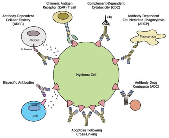 Bispecific antibody constructs bind MM cells through distinct targeted antigens and T cells through CD3 resulting in the killing of MM cells independent of major histocompatibility complex. B cell maturation antigen (BCMA), a member of the tumor necrosis factor receptor (TNFR) superfamily is one of the best-studied targets in the use of bsABs in MM [15,72,73,74] (Figure 1).