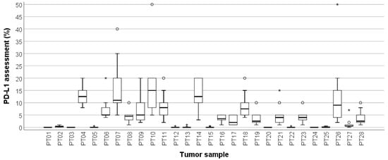 All ten participating pathologists evaluated all 28 TNBC cases in the proficiency test. There were no missing values. The overall ICC was 0.510 (95%CI 0.370–0.673), indicating borderline moderate agreement for PD-L1/SP142 assessed as percentages. Figure 1 shows the distribution of the PD-L1/SP142 percentages per TNBC in the proficiency set. PD-L1-negative TNBCs (Figure 2) generally presented with a range equaling zero, but the range between the 25th and 75th percentiles (P25 and P75, respectively) were substantially larger for PD-L1-positive TNBCs, which resulted in increased interobserver variability.
