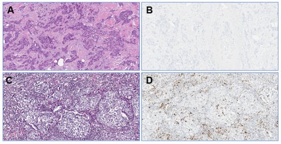 Triple-negative breast cancer (TNBC) is an aggressive breast cancer subtype, characterized by the absence of estrogen receptor (ER) and progesterone receptor (PR) expression, as well as lack of gene amplification and/or protein overexpression of the human epidermal growth factor receptor 2 (HER2) [1]. This surrogate molecular subtype accounts for approximately 10–12% of diagnosed breast cancers [2,3,4,5]. Histologically, TNBCs are generally associated with a high tumor grade, a high proliferation index, and high levels of tumor-infiltrating lymphocytes (TILs) [1]. Compared with other breast cancer subtypes, metastatic TNBCs have limited treatment options and a poor outcome, as targeted therapies were lacking till recently [6]. Patients with metastatic TNBC generally have rapid progression with a median overall survival of only 13 months [7]. New treatment options such as PARP inhibitors and immunotherapy, i.e., immune checkpoint inhibitors targeting the PD-1/PD-L1 (Programmed Death-Ligand 1) axis, are now emerging [8,9,10,11]. PD-L1 is a transmembrane protein that downregulates anti-cancer immune responses through binding to PD-1, an inhibitory protein expressed by activated T-lymphocytes. The binding of PD-L1 to PD-1 prevents T-cell activation through the T-cell receptor [6]. In TNBC, phase 1/2 trials have shown response rates between 5–23% with anti-PD(L)1 monotherapy in heavily pretreated patients. In the TONIC-trial, a non-comparative phase 2 trial assessing nivolumab (anti-PD-1) monotherapy with or without induction treatment, the overall response rate in metastatic TNBC was 20% [12]. Importantly, the phase 3 IMpassion130 trial has shown that the addition of anti-PD-L1 (atezolizumab) to standard chemotherapy (nab-paclitaxel) in the first line of treatment for patients with advanced TNBC results in an overall survival benefit of seven months in patients with a PD-L1-positive tumor [13]. Recent biomarker analysis of IMpassion130 showed that TILs and PD-L1 status predict benefit to PD-L1 inhibition [13]. Similar observations were made in the KEYNOTE-355 trial, wherein pembrolizumab (anti-PD-1) treatment was associated with improved progression-free survival in patients with TNBCs with a combined positivity score of PD-L1/22C3 ≥10 [14]. These data illustrate how immune-oncology could change the treatment landscape for TNBC in the near future.