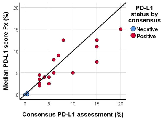 The median PD-L1/SP142 score in the proficiency set, based on the evaluation of all ten participants, correlated significantly with the consensus diagnosis (Spearman’s Rho = 0.956; p < 0.001; Figure 3). The ICC values for the PD-L1 score of each pathologist in comparison with all the other pathologists, as well as the consensus score and the median Px PD-L1 score are shown in Table 1. The PD-L1 assessment of nine out of ten (90%) pathologists showed good agreement when compared with the consensus score, and agreement was moderate for one pathologist (10%). The corresponding Bland-Altman plots visualize the deviations from the consensus score (Figure S1). Similarly, the PD-L1 assessment of seven (70%) pathologists showed good agreement with the median Px PD-L1 score, whereas agreement was moderate for one pathologist (10%) and excellent for two pathologists (20%).