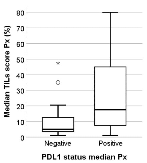 Box-and-whisker plot illustrating the median TILs scores Px for the PD-L1-negative and PD-L1-positive subgroups in this study cohort of 49 TNBC metastases. PD-L1-positive TNBC metastases have significantly higher TILs levels (p = 0.004). Circles represent outliers; asterisks represent extremes, * outliers, ° extremes.