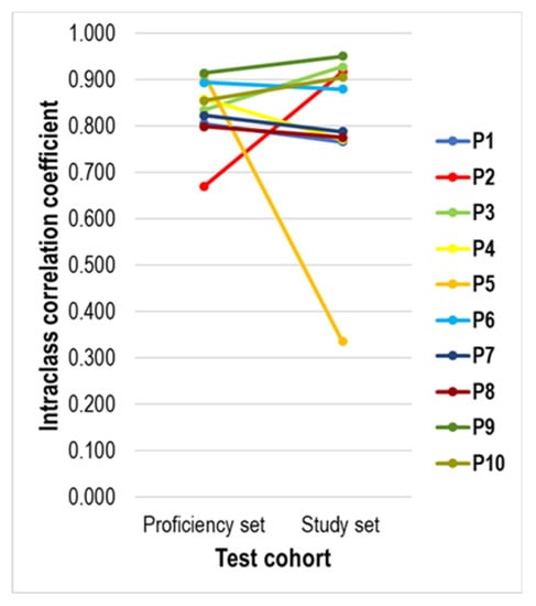 Comparison of the degree of interobserver agreement for PD-L1 assessment between the proficiency set and the study set per pathologist shows that the overall agreement seems similar for eight out of ten (80%) participants (Figure 6). The PD-L1 scores of P2 showed a higher agreement with the median PD-L1 scores in the study set than in the proficiency set, whereas the opposite was true for P5.