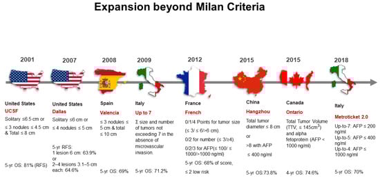 The good survival outcomes from the UCSF criteria encouraged transplant societies around the world to make efforts to maximize the number of patients with unresectable HCC who can benefit from transplant oncology. Numerous studies have expanded the UCSF criteria with great success (Figure 2) [,]. For example, criteria from Valencia, Spain included HCC patients with three or fewer nodules, each 5 cm or smaller in diameter, with a total tumor diameter less than or equal to 10 cm []. These criteria yielded a 5-year overall survival rate of 69%. Criteria from Hangzhou, China, included HCC patients with total tumor diameter less than or equal to 8 cm or patients with total tumor diameter greater than 8 cm whose AFP level is less than or equal to 400 ng/mL []. These criteria yielded a 5-year overall survival rate of 71% []. The French criteria featured a point scale in which 2 points or fewer indicates low risk []. For tumor size, 0, 1, and 4 points are assigned for lesion diameters less than or equal to 3 cm, greater than 3 but less than or equal to 6 cm, and greater than 6 cm, respectively. For the number of lesions, 0 points are given for three or fewer nodules, while 2 points are given for four or more. For AFP level, 0, 2, and 3 points are given for levels less than or equal to 100 ng/mL, more than 100 ng/mL but less than or equal to 1000 ng/mL, and more than 1000 ng/mL, respectively. These criteria yielded a 5-year overall survival rate of 68% []. For the Ontario criteria, patients were eligible based on total tumor volume (TTV) measured less than 145 cm3 and AFP is less than 1000 ng/mL. []. A recently developed selection system, known as Metroticket 2.0 Model, takes into account tumor size, number, and actual AFP value. Based on this system, patients with HCC have a 70% chance of HCC-specific 5-year survival after transplantation, their level of AFP should be less than 200 ng/mL, and the sum of number and size of tumors (in centimeters) should not exceed 7; if the level of AFP is 200–400 ng/mL, the sum of the number and size of tumors should be less than 5; if their level of AFP is from 400 to 1000 ng/mL, the sum of the number and size of tumors should be less than 4 []. In general, various beyond UCSF criteria yielded a 5-year overall survival rate ranging in average from 63% to 81%, which is believed to be an acceptable improvement of survival outcomes compared to no LT.
