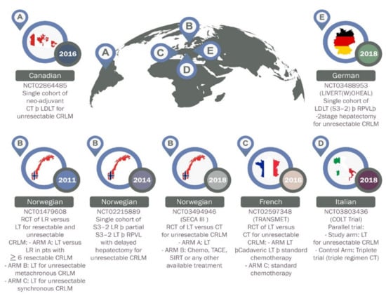Current prospective trials on liver transplantation for colorectal liver metastases. NCT, National Clinical Trial; CT, chemotherapy; LDLT, living donor liver transplantation; CRLM, colorectal Liver Metastases; LT, liver transplantation; TACE, transarterial chemoembolization; S, stage; SIRT, selective Internal Radiation Therapy; RCT, randomized controlled trial; RPVL, right portal vein ligation; A-E, name of countries as flagged off.
