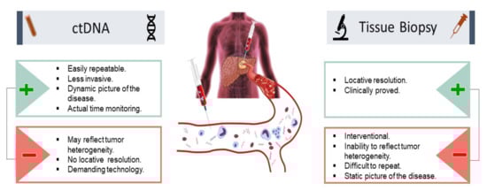 Utility of ctDNA in HCC for minimal residual disease evaluation and surveillance: pros and cons in comparison with tissue biopsy. (+) advantages (−) disadvantages.