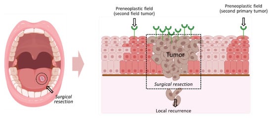 One of the obstacles in the early diagnosis of oral cancer is the lack of specific early markers to unequivocally identify the cancerous/pre-cancerous lesions, and more particularly, the surgical margins during the intervention (Figure 1) []. These facts render the treatment ineffective, resulting in a high recurrence rate. Therefore, a key issue in HNC pathogenesis is the identification of the preneoplastic fields of the mucosal epithelium. These contain genetically altered cells, related to carcinoma, that often extend into the surgical margins when tumors are excised, often causing local recurrences and secondary primary tumors [,].