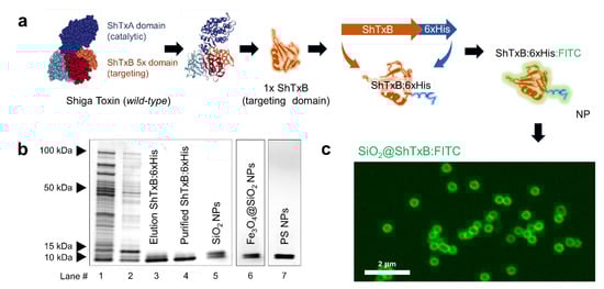 Ligand protein design. (a) Different domains in the structure of the Shiga toxin (ShTx). A single B domain (ShTxB) colored in orange is shown (UniProtKB ref. P09386). A diagram of the genetically modified ShTxB chimera protein and its situation on the nanoparticle is shown. The electrostatic interaction of the 6xHis tail orients the ligand peripherally on the particle. (b) SDS-PAGE analysis of ShTxB protein at different production and purification steps. (Lane# 1) protein expression in bacteria, (#2) column wash, (#3) elution of the protein from the column with imidazole, and (#4) PD-10 purified ShTxB used for bioconjugation. Lanes #5-6 show ShTxB stripped from functionalized SiO2, Fe3O4@SiO2, and PS particles (#7). (c) Confocal microscopy single Z plane image of 500 nm SiO2 particles bioconjugated with ShTxB coupled to FITC. The fluorescent halo around the particle is the FITC-stained recombinant protein.