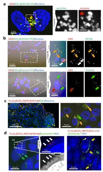 Figure 3 shows high-resolution fluorescent microscopy images of some HNC cells treated with the ShTxB-coated particles (green channel). Confocal microscopy imaging shows how all observed particles colocalize with GB3 receptors (red channel). The SiO2@ShTxB:FITC particles appeared to recruit and cluster the GB3 receptors around them (inset#1, red arrow) producing a “receptor clustering effect” similar to that described for the wild-type toxin on target cell membranes. This suggests the biological coating of the particles could behave biomimetically [,].