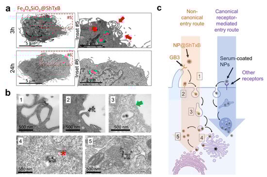 To further explore the intracellular fate of the bio-coated nanomaterials, we used TEM imaging on ultrathin sections of cells incubated with ShTxB-functionalized Fe3O4@SiO2 nanoparticles. The electron-dense core of the particles is particularly well suited for this purpose. The initial exposure of the HNC cells to the ShTxB-coated nanoparticles unchained an intense membrane activity (Figure 4a). Typically, cells exposed to ShTxB-coated nanoparticles display abundant actin-rich plasma-membrane processes, such as filopodia, lamellipodia, and membrane ruffles (inset #5, red arrows) closely reproducing the membrane response described for the wild-type toxin [,,]. Interestingly, 24 h after this initial contact the membrane returned to normal shape (inset #6).