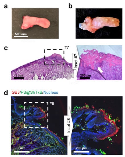 In vivo ShTxB-coated particle targeting. Macroscopic appearance of tongues of control (a) and 4NQO-treated mice (b). Macroscopic lesions, characteristic of squamous cell carcinoma, are visible on the oral mucosa. Leukoplakia and papilloma-like tumoral masses are distributed throughout the surface of the tongue. (c) A hematoxylin-eosin-stained section in a tongue in mice treated with 4NQO where severe dysplasia and an invasive squamous cell carcinoma (inset #7, white arrow) are observed. (d) Confocal microscopy image of a cryosection of the affected tissue where a tumoral mass is boxed (inset #8). GB3 receptor immunostaining (red channel) is observed on the surface of the lesions. Upon incubation with the PS@ShTxB (see Figure 2b) particles (green channel) for 10 min, the surface of the GB3-positive lesion is conspicuously coated with the ShTxB-coated nanoparticles. The cell nuclei are visible in the blue channel. These results suggest that this technique can be improved by using different types of nanoparticles to optimize their targeting and thus, be able to selectively apply treatments such as magnetic or optical hyperthermia.