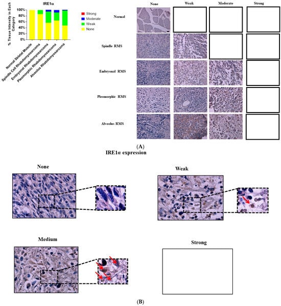 Immunohistochemical staining for IRE1α in human skeletal muscle and RMS tissue. (A,B). We detected IRE1α expression (red arrows) in a human RMS TMA; details on the TMA were mentioned in the Section 2. Three independent pathologists blindly evaluated the immunohistochemical IRE1α expression (None = no staining; W: Weak staining; M: Moderate staining; S: Strong staining); the empty slots indicate that no samples met the characteristics of that specific group. Our results show that IRE1α is associated with RMS (Table 1). The results also show that IRE1α expression is associated with ARMS, ERMS, PRMS, SRMS (Table 3). The scale bar refers to 50 µM.