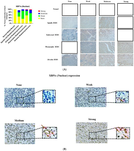 Immunohistochemical staining for sXBP1 in human skeletal muscle and RMS tissue. (A,B). We detected sXBP1 expression (red arrows) in human RMS TMA. Detailed information on the TMA was given in the Section 2. Three independent pathologists blindly evaluated the immunohistochemical sXBP1 expression (None = no staining; W: Weak staining; M: Moderate staining; S: Strong staining); the empty slots indicate that no samples matched the specifics of that group. Our results show that sXBP1 expression is associated with ARMS, ERMS, PRMS, and SRMS (Table 5). The scale bar refers to 50 µM.