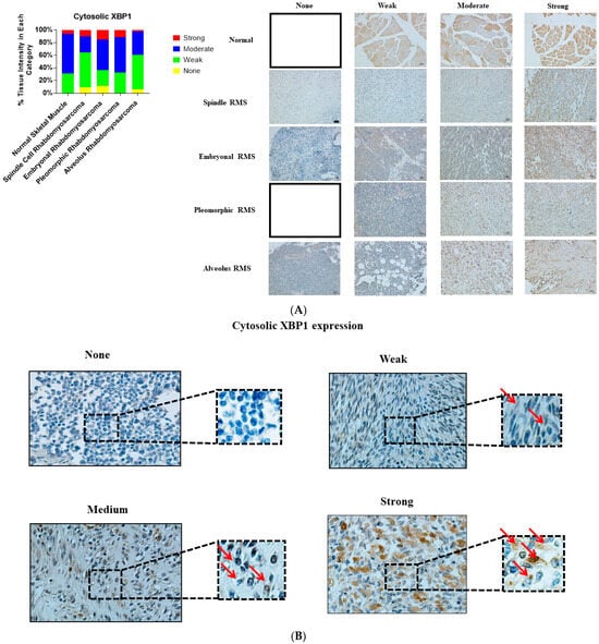 Immunohistochemical staining for cytosolic XBP1 in human skeletal muscle and RMS tissue. (A,B). We detected cytosolic XBP1 expression (red arrows) in a human RMS TMA. Details on the TMA were outlined in the Section 2. Three independent pathologists blindly evaluated the immunohistochemical cytosolic XBP1 expression (None = no staining; W: Weak staining; M: Moderate staining; S: Strong staining); the empty slots indicate that no samples matched the specifics of that group. Our results show that cytosolic XBP1 is associated with ARMS and SRMS (Table 4). The scale bar refers to 50 µM.