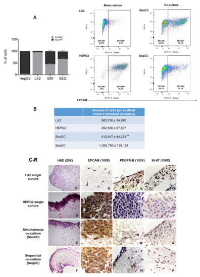 Localization and fluorescence-activated cell sorting (FACS) analysis of LX2 and HepG2 cells in single and co-cultures in 3D liver scaffolds. (A) Percentage of LX2 and HepG2 cells engrafted in healthy scaffolds in single cultures of LX2 or HepG2 cells, and co-cultures SimCC and SeqCC as determined by Flow cytometry analysis using EPCAM antibody. (B) Quantification of engrafted cells in single-cell cultures of LX2, HepG2, and co-cultures SimCC and SeqCC in healthy 3D liver scaffolds (** p ≤ 0.01 SimCC compared to SeqCC). (C–F) Hematoxylin and Eosin staining of LX2 and HepG2 repopulating 3D ECM healthy liver scaffolds showed LX2 cells diffusely spread inside the scaffold, while HepG2 cells engrafted at the periphery of the 3D scaffold (20X magnification). (G–J) Distribution of each cell type in single cultures, simultaneous co-culture (SimCC), and sequential co-culture (SeqCC) confirmed by epithelial cell marker EPCAM and (K–N) LX2 cell marker PDGFR-β immunohistochemistry (100× magnification). (O–R) Cell proliferation was detected by performing Ki-67 immunohistochemistry (100× magnification).