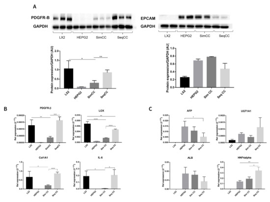In this set of experiments, cell-specific markers were evaluated to further identify the effect of single cultures versus co-cultures and the effect of repopulation on 3D ECM scaffolds. PDGFR-β protein expression showed a significant downregulation in SimCC compared to LX2 mono-cultures (* p ≤ 0.05). In contrast, PDGFR-β protein expression showed significant upregulation in SeqCC versus SimCC (** p < 0.01) further confirming that the majority of cells in SeqCC were LX2 cells as suggested by FACS analysis (Figure 1A,B). HepG2 cells grown in mono-culture and SimCC showed a similar tendency towards increased EPCAM protein expression while those in SeqCC showed a trend towards downregulation of EPCAM expression compared to SimCC (Figure 2A), confirming the FACS analysis data that demonstrated more LX2 cells than HepG2 cells in SeqCC (Figure 1A).