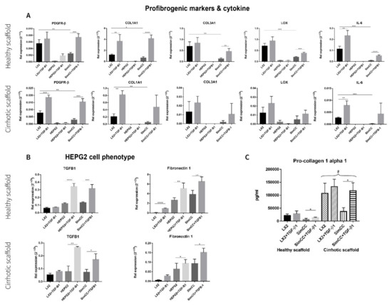 To further investigate the effect of TGF-β1-induced expression on COL1A1 expression, a key pro-fibrogenic ECM factor, LX2 mono-culture and SimCC were grown simultaneously in healthy and cirrhotic 3D scaffolds. The secretion of pro-collagen1a1 showed a significant upregulation in all conditions when LX2 cells were engrafted in cirrhotic 3D scaffolds versus healthy 3D scaffolds (# p ≤ 0.01) (Figure 3C). This suggested that tissue-specific ECM can induce progression of liver fibrosis as shown in cirrhotic 3D scaffolds versus healthy 3D scaffolds. Further, LX2 cells exposed to TGF-β1 for 48 h and grown in SimCC significantly secreted more pro-collagen1a1 protein compared to those in SimCC without TGF-β1 exposure in both 3D healthy (* p ≤ 0.05) and cirrhotic liver scaffolds (* p ≤ 0.05) (Figure 3C). Overall, these data demonstrate significant differences in protein and gene expression between cells grown in mono-culture versus SimCC and when engrafted in healthy 3D scaffolds versus 3D cirrhotic scaffolds with or without TGF-β1 treatment.