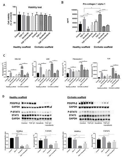 Although Sorafenib is known as a first level anti-cancer drug for patients with advanced tumors [3,30,31], it is also known to have anti-fibrotic effects in in vitro and in vivo models [32,33,34] and its targets have been well elucidated in several reports [32,35,36]. Thus, simultaneous co-cultures of LX2 and HepG2 (SimCC) were treated with Sorafenib (7 µM) as was previously shown to have anti-fibrotic effects in LX2-HepG2 co-cultures in 3D spheroids [26] with or without TGF-β1 (5 ng/mL) for 48 h. First, cell viability was quantified to exclude Sorafenib’s possible anti-cancer effect, i.e., apoptosis-inducing effect, as in this experiment Sorafenib’s anti-fibrotic effect will be investigated. As shown in Figure 4A, exposure to Sorafenib of co-cultures in both types of scaffolds, with or without TGF-β1, did not affect cell viability when compared to non-treated control conditions thus excluding Sorafenib’s apoptotic-inducing effect.