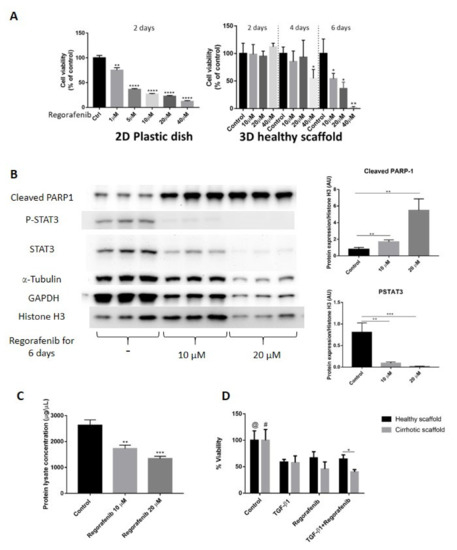 In this set of experiments, we validated the co-cultures and 3D ECM scaffolds as platforms to investigate the anti-cancer effects by evaluating Regorafenib, an oral multikinase inhibitor, which is currently recommended as a second-line anti-cancer treatment for patients with advanced HCC who progressed after Sorafenib treatment [3,27]. First, we determined Regorafenib’s concentration required to inhibit 50% HepG2-LX2 cell viability (IC50) in 2D cell cultures and co-cultures engrafting healthy 3D scaffolds. To calculate IC50, the inhibitory concentration against cell viability was plotted with Graph Pad Prism software, followed by using the dose–response-inhibition equation under nonlinear regression analysis to identify IC50 which was calculated to be 16.6 µM. Important, we demonstrate that to obtain Regorafenib’s IC50, a four-fold higher dose of Regorafenib and a two-fold increase in exposure time was needed in LX2-HepG2 co-cultures engrafted in 3D scaffolds compared to 2D cultures (16.6 μM for 6 days in 3D versus 3.6 μM for 2 days in 2D) (Figure 5A). Next, co-cultures were engrafted in 3D healthy scaffolds and treated with Regorafenib (16.6 µM for 6 days). Regorafenib’s anti-cancer effect, i.e., induction of apoptosis was further demonstrated at the protein level, by activation of PARP-1 cleavage protein expression in a dose-dependent manner when compared with control co-culture cells (Figure 5B). Phosphorylated STAT3 has been reported to modulate Bcl-2 gene expression involved in the anti-apoptotic response of HCC cells, resulting in caspase-3 activation and increased PARP cleavage [37]. Indeed, our data demonstrated that Regorafenib’s-induced PARP-1 expression coincided with a reduction in phosphorylation of STAT3 (P-STAT3) and STAT3 protein expression in Regorafenib exposed cells versus control non-treated co-cultured cells. Regorafenib downregulated both α-tubulin and GAPDH protein expression in a dose-dependent way, as previously demonstrated [38]. Furthermore, total protein quantification indicated that the concentrations of total protein lysate obtained from co-cultures engrafting healthy 3D scaffolds and treated with Regorafenib (10–20 µM for 6 days) were lower than in control co-cultures in 3D healthy liver scaffolds (** p ≤ 0.01) (Figure 5C), further suggesting Regorafenib’s apoptotic effect. Overall, these data demonstrated that Regorafenib induced apoptosis in LX2-HepG2 co-cultures engrafting 3D healthy liver scaffolds.