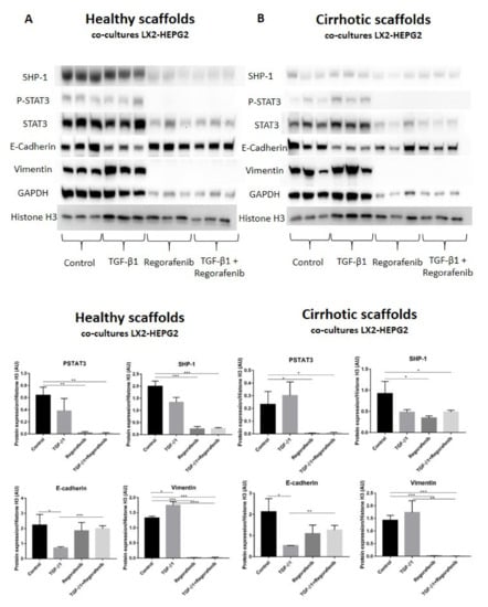 Protein expression of the LX2 and HepG2 cell co-cultures treated with TGF-β1 and/or Regorafenib in healthy and cirrhotic liver 3D scaffolds. Western blot and densitometry analysis of SHP-1, P-STAT3, STAT3, E-cadherin, Vimentin, and GAPDH protein expression of LX2 and HepG2 cells co-cultured in 3D healthy (A) and cirrhotic scaffolds (B) following TGF-β1 5 ng/mL with/without Regorafenib 16.6 µM exposure for 6 days (n = 4 scaffolds per condition, * p ≤ 0.05, ** p ≤ 0.01, *** p ≤ 0.001, and **** p ≤ 0.0001). (Figure S1: Whole blot showing all the bands with all molecular weight markers on the Western).