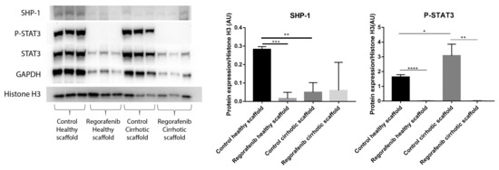 Protein expression of LX2-HepG2 co-cultures treated with Regorafenib compared to control in healthy and cirrhotic 3D scaffolds. Western blot and densitometry analysis of SHP-1, P-STAT3, STAT3 and GAPDH protein expression of LX2 and HepG2 cells co-cultured in healthy and cirrhotic 3D liver scaffolds treated with Regorafenib 16.6 µM for 6 days compared to internal controls (n = 4 scaffolds per condition, * p ≤ 0.05, ** p ≤ 0.01, *** p ≤ 0.001, and **** p ≤ 0.0001). (Figure S1: Whole blot showing all the bands with all molecular weight markers on the Western).
