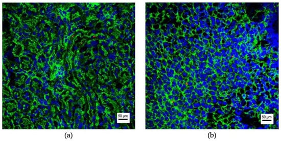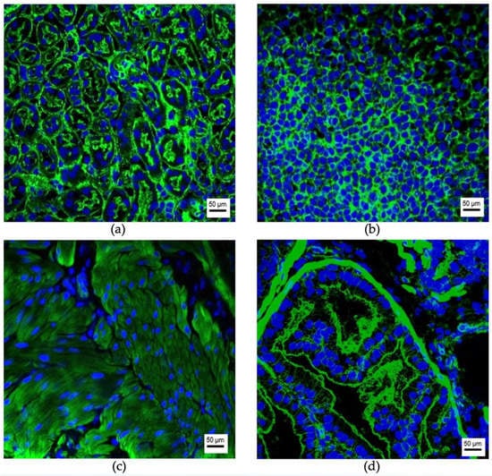 Immunostaining: To identify uptaking cell types, several immunofluorescence stainings were performed using the above-mentioned tissue slides. The slides were washed three times in PBS and unspecific protein binding sites were blocked by incubation with a blocking solution (PBS with 3% bovine serum albumin (Serva Electrophoresis GmbH, Heidelberg, Germany) and 0.3% Triton X-100 (Sigma-Aldrich, St. Louis, MO, USA)) for one hour at room temperature. Thereafter, the slides were incubated with the following primary antibodies at 4 °C overnight: CD31 (1:100; Abcam, Cambridge, UK), EpCAM (1:100; Cell Signaling Technology, Danvers, MA, USA), F4/80-Alexa488 (1:100; Thermo Fisher, Waltham, MA, USA), Vimentin-Alexa488 (1:200; Cell Signaling Technology, Danvers, MA, USA), and Sodium-Potassium-ATPase-Alexa488 (1:50; Thermo Fisher, Waltham, MA, USA). In cases when the primary antibody was not directly fluorescence labeled (CD31 and EpCAM), this was followed by PBS washing and secondary antibody incubation for two hours at room temperature (anti-rabbit Alexa488; 1:1000; Thermo Fisher, Waltham, MA, USA). After washing in PBS, the slides were mounted with DAPI-containing Vectashield® antifade mounting medium (Vector Laboratories, Burlingame, CA, USA) and analyzed within 24 h using a Car Zeiss LSM780 laser scanning microscope (Carl Zeiss GmbH, Jena, Germany).