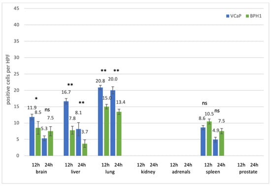 Prostate EVs were detected in the lung, liver, brain, and spleen after intravenous injection (in descending amount; Figure 6). EVs from the prostate cancer cell line VCaP were taken up in significantly higher amounts than EVs from the benign prostate hyperplasia cell line BPH1 in all organs except the spleen (after 12 and 24 h; p < 0.01 for liver and lung after 12 and 24 h, p < 0.05 in the brain after 12 h) and the brain (after 24 h). For all organs and cell lines, there were more EV signals 12 h after injection, compared to 24 h after injection.