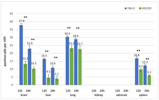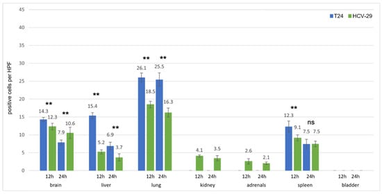 For the bladder cell lines T24 (invasive urothelial carcinoma) and HCV-29 (benign urothelial cells), the strongest EVs signals appeared in the lung, followed by the liver, brain and spleen (about same amount of EV-positive cells; Figure 8). Again, EV signals from the tumor cell line were stronger than those from the benign cell line, especially in lung, liver, and brain (p < 0.01 after 12 h and 24 h), and more EVs were detectable after 12 h than after 24 h. One exception is the uptake of EVs in the brain after 24 h, were there were significantly more signals for HCV29 EVs than for T24 EVs. In contrast to all other cell lines, HCV-29 EVs were found in the kidneys and adrenals at very low numbers (Figure 5).