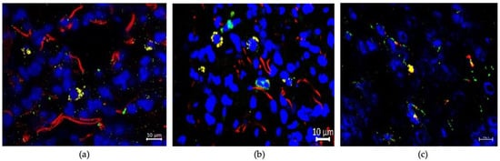 We aimed to further elucidate which cell types were responsible for EV uptake and where in these organs the EVs were located. Therefore, we performed immunofluorescence staining with antibodies specifically identifying distinct cell types (EpCAM: epithelial cells; Vimentin: fibroblasts; F4/80: macrophages; CD31: endothelial cells) or subcellular structures (Na-K-ATPase: cell membrane) and investigated the colocalization of their signals with those of fluorescence labeled EVs. In the lung, colocalization of EVs with epithelial cells and macrophages could be observed (Figure 9a,b). Of note, besides the superposed yellow signals, there were still many red EV signals representing non-colocalized EVs. Furthermore, EVs were found in close proximity to large bronchioli and vessels but seemed not to be taken up by them, as there were no yellow signals indicating colocalization (Figure S7). In the liver, EVs were found colocalized with macrophages (Figure 9c). In contrast, a colocalization of EVs with epithelial cells, fibroblasts or endothelial cells was not observed (Figure S8). For the brain, no colocalization with any of the analyzed cell types could be detected. However, as in the lung, EVs seemed to be localized in close proximity to larger vessels (Figure S9). The complete images off all colocalization studies can be found in Figures S10–S21.
