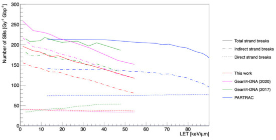 - Tran, H.N.; Ramos-Mendez, J.; Shin, W.G.; Perrot, Y.; Faddegon, B.; Okada, S.; Karamitros, M.; Davidkova, M.; Stepan, V.; Incerti, S.; et al. Assessment of DNA damage with an adapted independent reaction time approach implemented in Geant4-DNA for the simulation of diffusion-controlled reactions between radio-induced reactive species and a chromatin fiber. Med. Phys. 2021, 48, 890–901. [Google Scholar] [CrossRef]