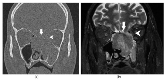 - Meerwein, C.M.; Pazahr, S.; Soyka, M.B.; Hüllner, M.W.; Holzmann, D. Diagnostic Accuracy of Computed Tomography and Magnetic Resonance Imaging Compared to Surgical Exploration for Anterior Skull Base and Medial Orbital Wall Infiltration in Advanced Sinonasal Tumors. Head Neck 2020, 42, 2002–2012. [Google Scholar] [CrossRef] [PubMed]