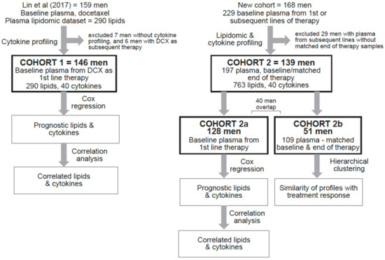 In order to analyse the changes in lipid and cytokine profiles at progression on therapy, another subset of Cohort 2, referred to as Cohort 2b, was examined. Cohort 2b consisted of 51 men with matched baseline and end of treatment (EOT) plasma samples. The EOT samples were collected at disease progression or at baseline of the subsequent treatment (Figure 1). There were 56 pairs of baseline EOT samples, as 5 men had paired samples from 2 subsequent treatment lines, whereas the rest only had matched samples from 1 treatment line.