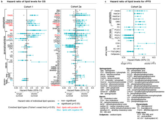 Cox regression analyses of baseline levels of individual lipids for first line therapy identified 80 lipids for Cohort 1 and 128 lipids for Cohort 2a that were significantly associated with OS (p < 0.05, Figure 2b, File S1). There were 26 prognostic lipids that were in common between both cohort (File S1). Lipids with higher baseline levels that were associated with shorter OS were significantly enriched with sphingolipids such as ceramide (Cer(d)), trihexosylceramide (Hex3Cer), and ganglioside GM3 for both cohorts and sphingomyelin for Cohort 1 (Fisher’s exact test p < 0.05, Tables S1 and S2). Lipids with lower levels that were associated with shorter OS in Cohort 1 were enriched for TG and LPC, whereas those in Cohort 2a were enriched for the ether lipids PE(O), PE(P) and TG(O), and PC (Fisher’s exact test p ≤ 0.04, Tables S1 and S2).