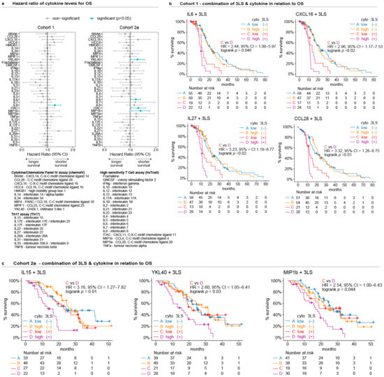 Prognostic baseline levels of circulating cytokines for Cohort 1 and Cohort 2a: (a) Forestplots of hazard ratios for baseline plasma levels of cytokines in relation to OS; (b,c) Kaplan–Meier curves of the combined presence of 3LS with cytokine levels in relation to OS in Cohorts 1 and 2a, respectively (high cytokine level = above median, low cytokine level = below median).