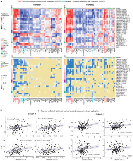 Correlation between circulating lipids and cytokines: (a) Heatmaps of Pearson coefficient and p-values of correlation between the plasma levels of cytokines and 26 prognostic lipids for Cohort 1 (left, 146 plasma samples) and Cohort 2 (right, 197 plasma samples). The cytokines are ordered by the hierarchical clustering of the Pearson coefficients of Cohort 1 (Euclidean distance); (b) Examples of scatterplots of the plasma levels IL6 or IL8 versus those of ceramide(d18:1/18:0) or ceramide(d18:1/24:1).