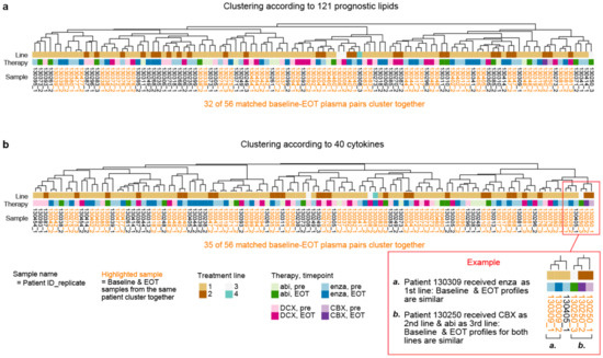 Hierachical clustering of 56 pairs of matched baseline and EOT plasma samples for Cohort 2b. Samples are clustered according to the profiles of 121 prognostic lipids (a) or 40 cytokines (b). Matched baseline and EOT samples that paired together (cluster next to each other) are highlighted in orange. Heatmaps of the lipid or cytokine levels are displayed in Figure S4.