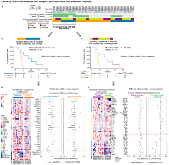 Association of prognostic lipid profiles with treatment response in Cohort 2b: (a) Status of 3LS and similarity of matched baseline and EOT samples according to hierarchical clustering from Figure 5; (b,c) Kaplan–Meier curves of rPFS for treatment lines with 3LS at baseline, stratified by similarity of baseline EOT lipid or cytokine profiles; (d,e) lipid and cytokine fold change at EOT displayed as heatmap of fold change for each baseline EOT pair and forest plot of average fold change. Lipids/cytokines with notable changes are indicated by the orange outline in the forest plot.