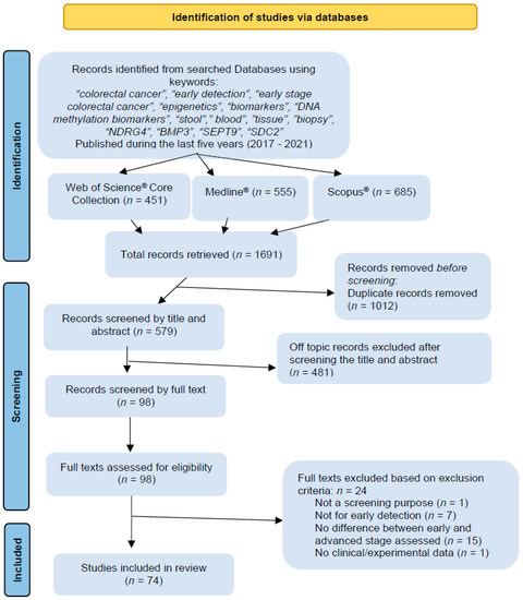 We searched all fields, topic (Web of Science®), article title, abstract, and keywords (Scopus®). Firstly, we performed four search queries, one per each investigated biomarker (NDRG4, BMP3, SEPT9, and SDC2), using the key terms: (1) «colorectal cancer» AND « NDRG4» AND « early detection»; (2) «colorectal cancer» AND « BMP3» AND « early detection» (3) « colorectal cancer» AND « SEPT9» AND «early detection» (4) «colorectal cancer» AND «SDC2 » AND «early detection». Then, a broader search was employed: (5) «colorectal cancer» AND «epigenetics» AND «biomarkers»; (6) «colorectal cancer» AND «DNA methylation biomarkers». Finally, a more stage-specific query was addressed: (7) «early-stage colorectal cancer» AND «DNA methylation» AND «stool»; (8) «blood» OR (9) «tissue» OR (10) «biopsy» OR (11) «early detection of colorectal cancer» AND «DNA methylation biomarkers». We selected all randomized clinical trials (RCTs), clinical trials (CT), clinical case series (CCS), clinical cases (CC), reports, and preclinical studies published in the specified period in the searched databases in the English language. There was no restriction on geographical region, ethnicity, or specific population. On 10 July 2021 and 11 July 2021, we searched the Web of Science® Core Collection, and on 24 August 2021, we explored the MEDLINE® and Scopus® databases.
