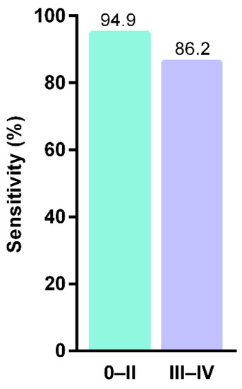 SDC2 is a transmembrane protein implicated in cellular proliferation, migration, cell–matrix interaction, and angiogenesis [53]. SDC2 methylation (Table S1) was quantified in two studies using tissue and stool [33,34]; one study used tissue and bowel lavage [35], and three studies evaluated DNA methylation only in stool [36,37,38]. Only one study had paired samples [33]. Sensitivities for stages I/II were between 83.3–91.4%, and 89.6–100% for stage III/IV [34,36,37]. Although evaluation of SDC2 methylation is indicated for early detection of colorectal cancer, it seems that assay sensitivity is superior for stage III/IV, while for stage I/II is satisfactory, thus displaying a limited stage specificity.