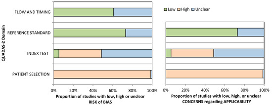 Quality assessment results using the QUADAS-2 tool are shown below as a summary graph (Figure 6), and in Table S5, tabular results are presented. The patient selection domain shows the highest potential risk of bias due to the case–control study design. The index test rated unclear risk of bias in 39/74 studies, followed by 32 studies which were scored as having a high potential risk of bias considering their ambiguity or lack of information regarding blinding, performing the test as per the manufacturer’s guidelines, or setting a cut-off value. For most of the studies (54/74), if colonoscopy was used as the reference standard, the risk of bias was considered low, while an unclear rating was giving for any uncertainty concerning colonoscopy assessment prior to methylation assays. The flow and timing domain was judged as having a low risk of bias in 45 studies. Applicability concerns were serious for patient selection because included studies employed a clinical setting rather than a screening one.