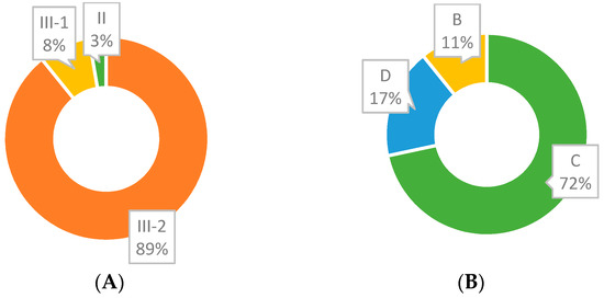 (A). III-2 accounts for the majority of ’Evidence for Outcome—Level (Quality) of evidence for diagnostic tests” (NHMRC Evidence Hierarchy). (B) C accounts for the majority of grades (Strength) of recommendation.