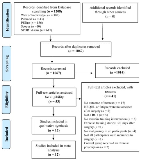 In the case of preoperative exercise programs, the first assessment of HRQoL or fatigue after surgery was considered. Studies that only reported preoperative values of HRQoL or fatigue were excluded.