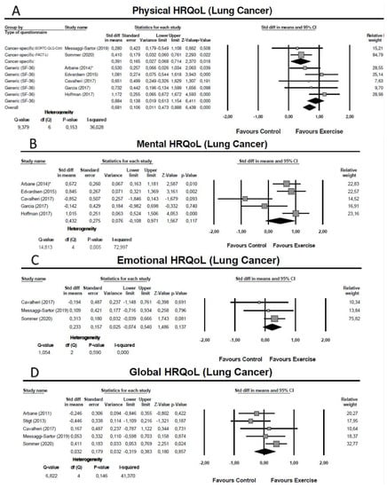 Five studies conducted postoperatively (initiated between the first postoperative day and 10 weeks after surgery) assessed the global HRQoL using as summary measure the total score of the FACT-L [61], the global quality of life of the EORTC-QLQ-C30 [24,62,67], and the total score of the Saint-George Respiratory Questionnaire (SGRQ) [64]. The meta-analysis showed no significant effect of exercise training in the global HRQoL (SMD = 0.03: 95% CI: [−0.32; 0.38]; Z = 0.18; p = 0.86; I2 = 41%) (Figure 2D).