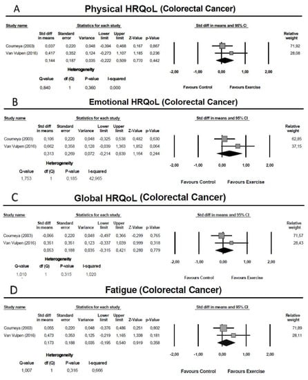Meta-analysis for the effect estimate of exercise training in colorectal cancer patients: (A) Physical domain; (B) Emotional Domain; (C) Global health-related quality of life; (D) Fatigue.